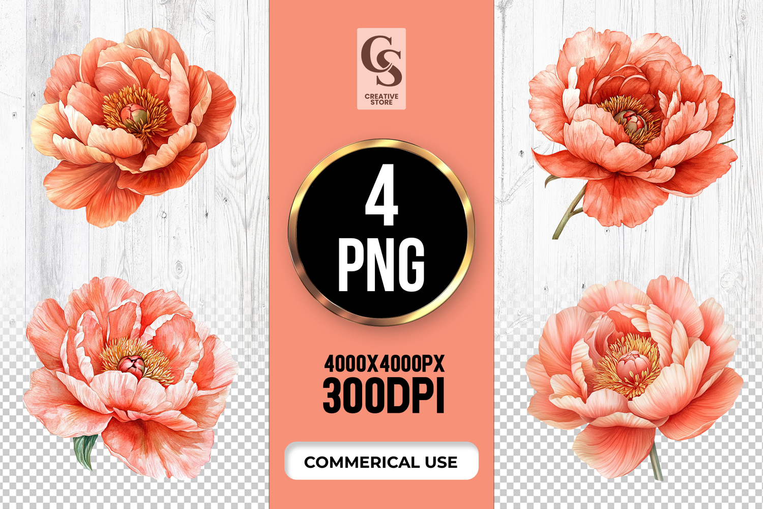 4 Coral Peony Flower Clipart Sublimation PNG Files Perfect for Greeting Cards, Invitations, Junk Journal, Party Decor, Scrapbooking and many other craft projects.