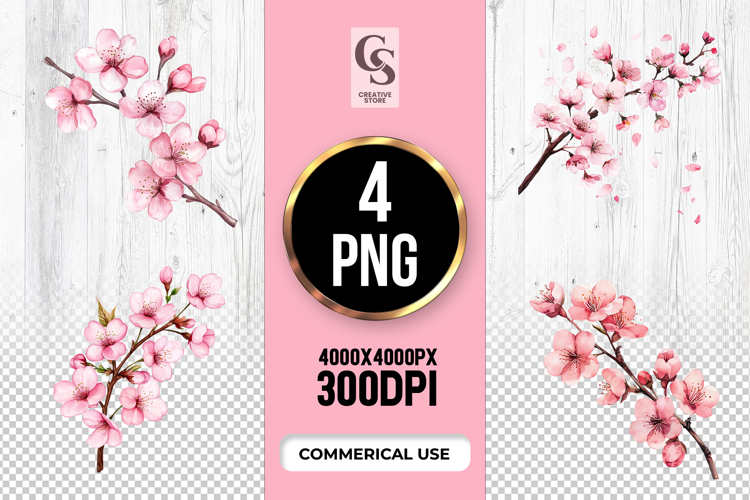4 Cherry Blossom Branch Clipart Sublimation PNG Files Perfect for Greeting Cards, Invitations, Junk Journal, Party Decor, Scrapbooking and many other craft projects.