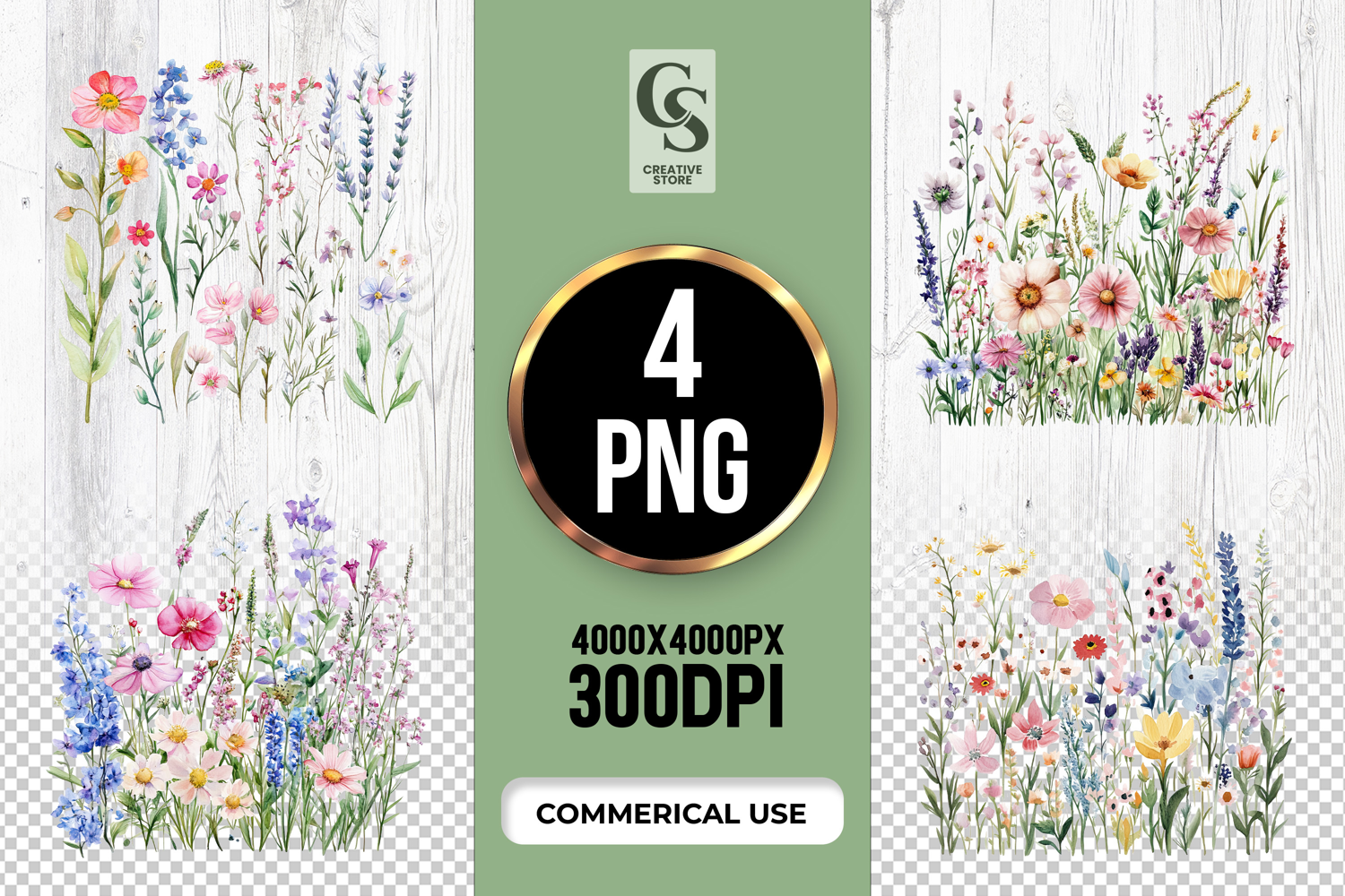 4 Wildflower Meadow Clipart Sublimation PNG Files Perfect for Greeting Cards, Invitations, Junk Journal, Party Decor, Scrapbooking and many other craft projects.