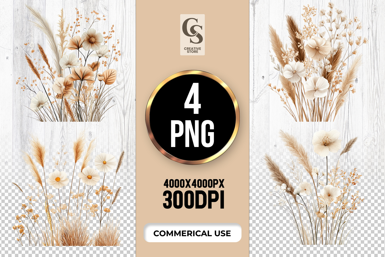 4 Boho Dried Floral Clipart Sublimation PNG Files Perfect for Greeting Cards, Invitations, Junk Journal, Party Decor, Scrapbooking and many other craft projects.