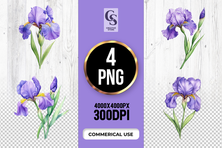4 Purple Iris Flower Clipart Sublimation PNG Files Perfect for Greeting Cards, Invitations, Junk Journal, Party Decor, Scrapbooking and many other craft projects.
