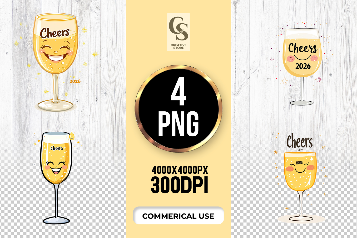 4 Cute Cheers Champagne Clipart Sublimation PNG Files Perfect for Greeting Cards, Invitations, Junk Journal, Party Decor, Scrapbooking and many other craft projects.