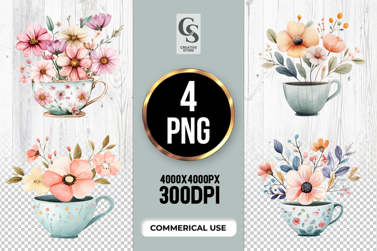 4 Vintage Floral Teacup Bouquet Clipart PNG Files Perfect for Greeting Cards, Invitations, Junk Journal, Party Decor, Scrapbooking and many other craft projects.