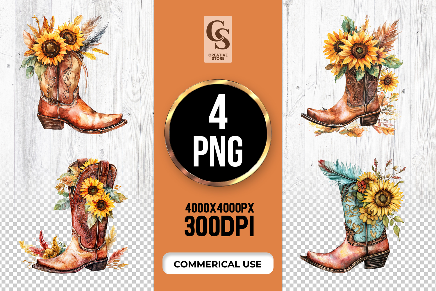 4 Watercolor Cowboy Boot Sunflower Clipart Sublimation PNG Files Perfect for Greeting Cards, Invitations, Junk Journal, Party Decor, Scrapbooking and many other craft projects.