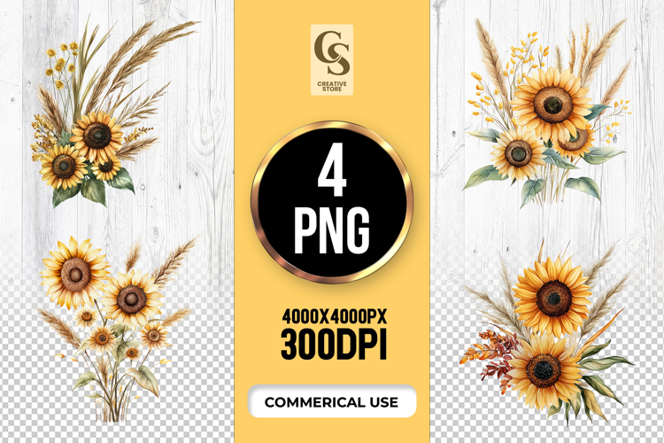 4 Sunflower Floral Arrangement Clipart Sublimation PNG Files Perfect for Greeting Cards, Invitations, Junk Journal, Party Decor, Scrapbooking and many other craft projects.