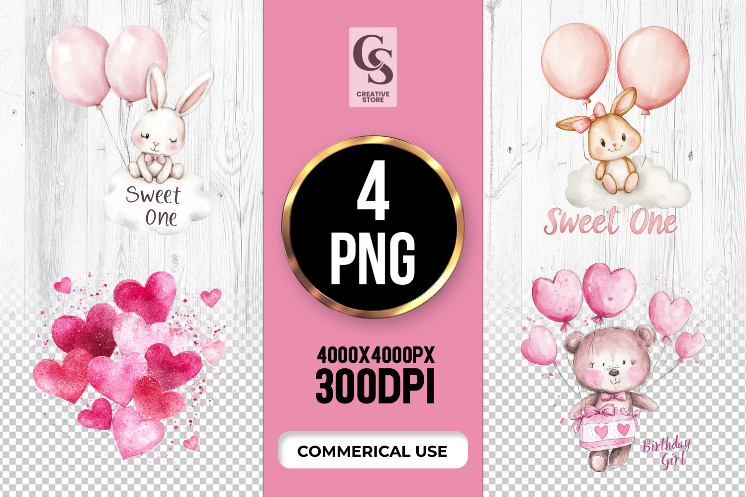Nursery Animal Clipart Baby Girl Sublimation Baby Bunny Clipart Pink Bear Png Adorable Kids Clipart Cute Animal Watercolor Birthday Balloon Png Watercolor Bunny Art Sweet One Birthday Art Pastel Baby Png