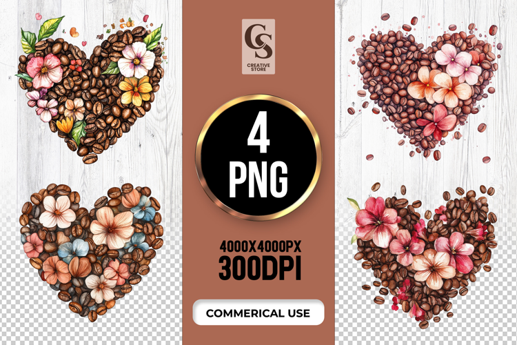 4 Coffee Bean Floral Heart Clipart PNG Files Perfect for Greeting Cards, Invitations, Junk Journal, Party Decor, Scrapbooking and many other craft projects.