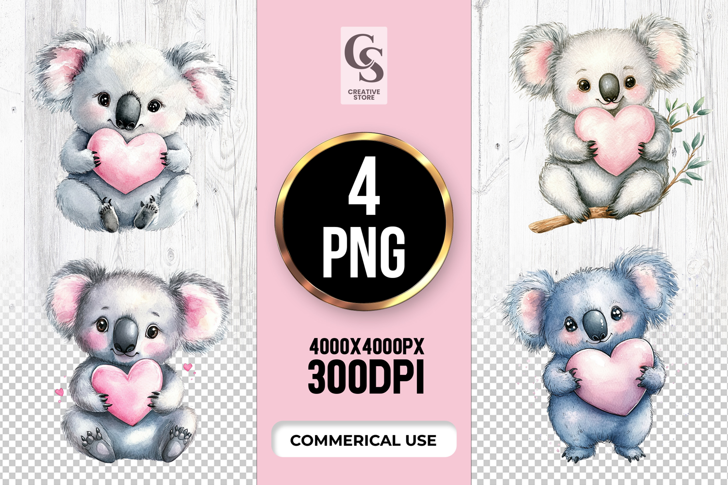 4 Cute Koala Holding Pink Heart Clipart Sublimation PNG Files Perfect for Greeting Cards, Invitations, Junk Journal, Party Decor, Scrapbooking and many other craft projects.