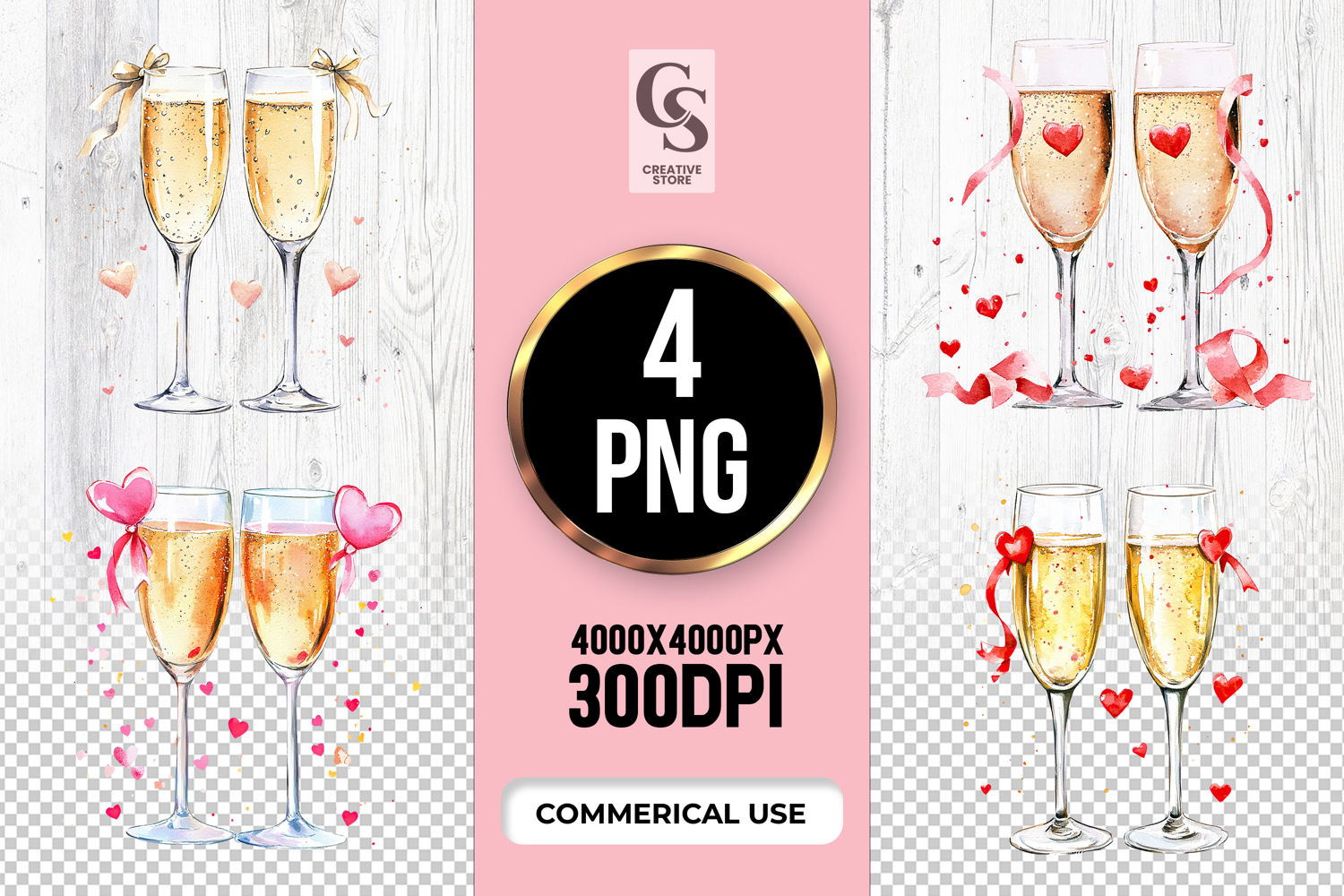 4 Champagne Glass Toast Heart Clipart Sublimation PNG Files Perfect for Greeting Cards, Invitations, Junk Journal, Party Decor, Scrapbooking and many other craft projects.