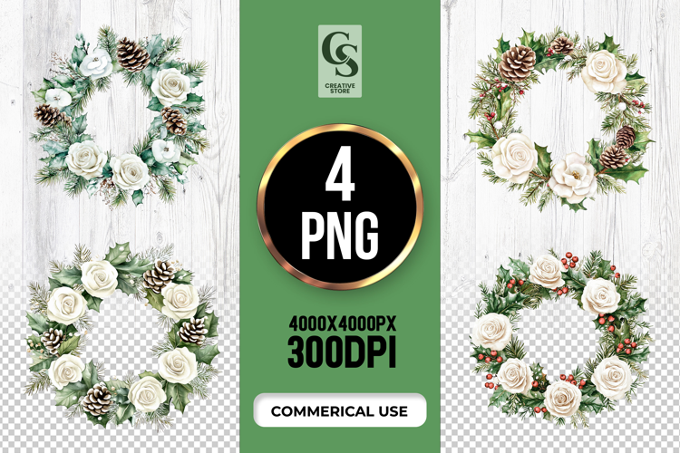 4 White Rose Pine Wreath Watercolor Clipart Sublimation PNG Files Perfect for Greeting Cards, Invitations, Junk Journal, Party Decor, Scrapbooking and many other craft projects.