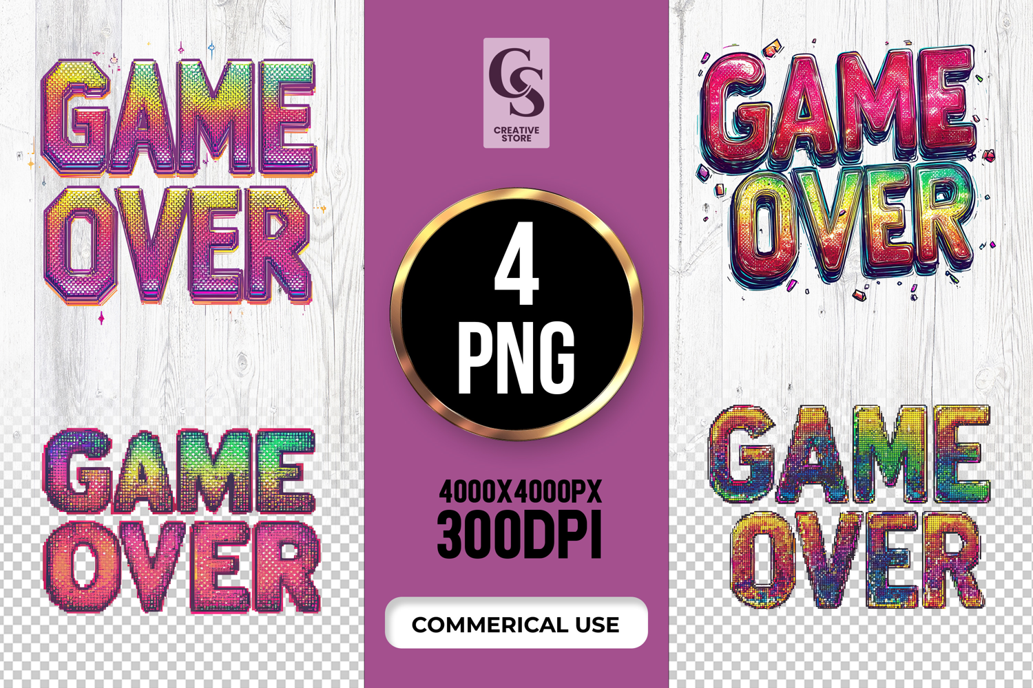 4 Game Over Pixel Text Clipart Sublimation PNG Files Perfect for Greeting Cards, Invitations, Junk Journal, Party Decor, Scrapbooking and many other craft projects.