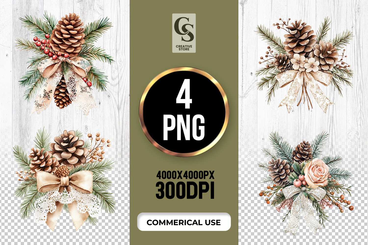 4 Pinecone Ribbon Floral Clipart Sublimation PNG Files Perfect for Greeting Cards, Invitations, Junk Journal, Party Decor, Scrapbooking and many other craft projects.
