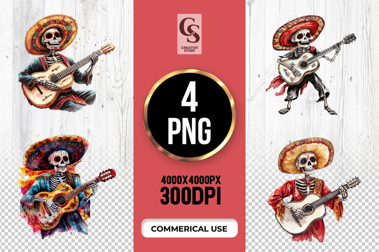 4 Skeleton Guitarist Watercolor Clipart PNG Files Perfect for Greeting Cards, Invitations, Junk Journal, Party Decor, Scrapbooking and many other craft projects.