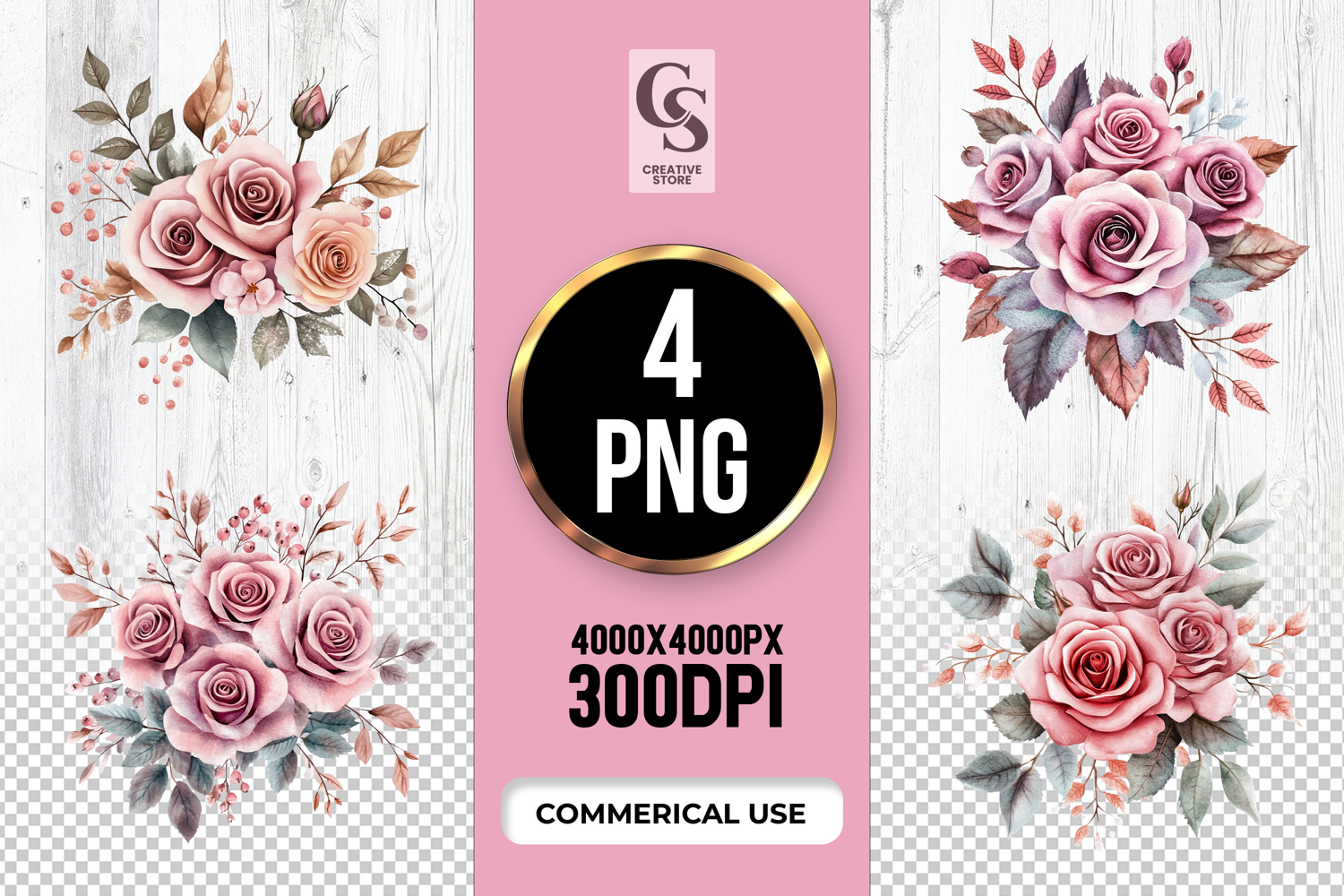 4 Dusty Pink Rose Floral Bouquet Clipart PNG Files Perfect for Greeting Cards, Invitations, Junk Journal, Party Decor, Scrapbooking and many other craft projects.