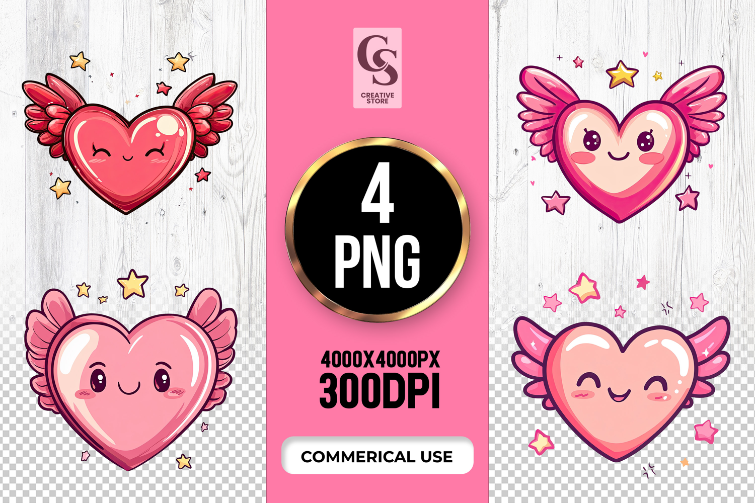 4 Cute Winged Heart Cartoon Clipart PNG Files Perfect for Greeting Cards, Invitations, Junk Journal, Party Decor, Scrapbooking and many other craft projects.