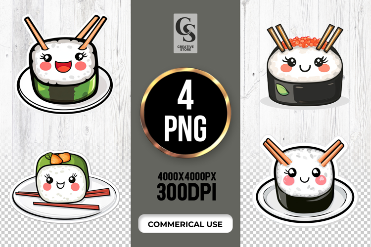 4 Cute Kawaii Sushi Roll Clipart Sublimation PNG Files Perfect for Greeting Cards, Invitations, Junk Journal, Party Decor, Scrapbooking and many other craft projects.