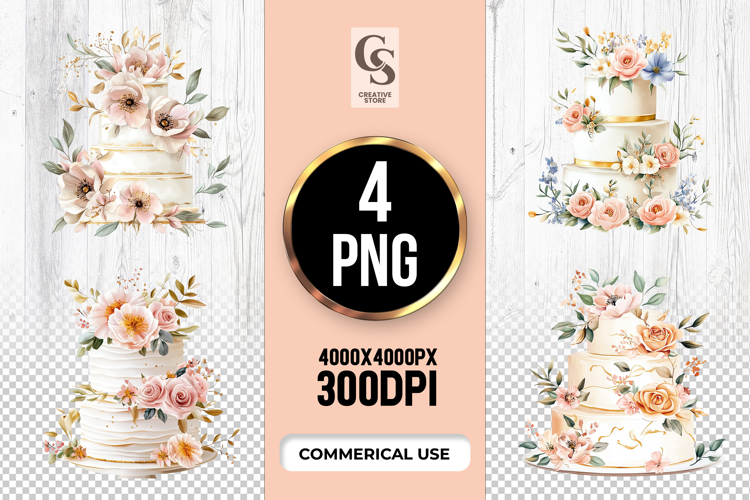 4 Elegant Floral Wedding Cake Clipart Sublimation PNG Files Perfect for Greeting Cards, Invitations, Junk Journal, Party Decor, Scrapbooking and many other craft projects.