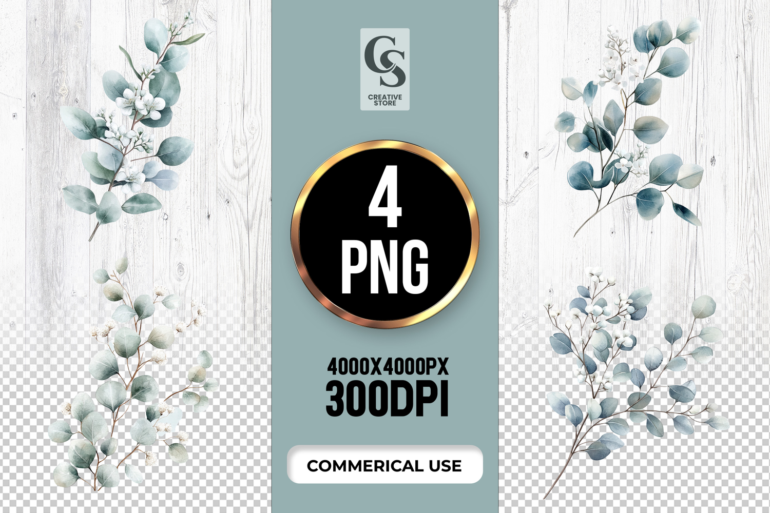 4 Watercolor Eucalyptus Branch Clipart Sublimation PNG Files Perfect for Greeting Cards, Invitations, Junk Journal, Party Decor, Scrapbooking and many other craft projects.