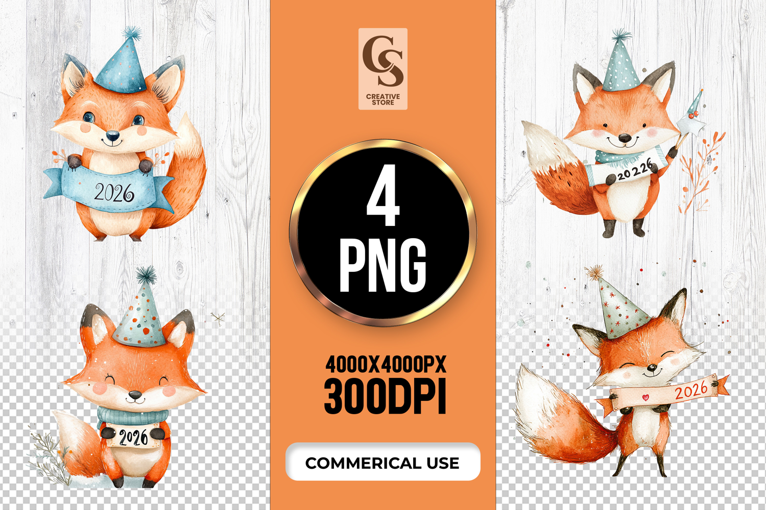 4 Cute Fox Party 2026 Clipart Sublimation PNG Files Perfect for Greeting Cards, Invitations, Junk Journal, Party Decor, Scrapbooking and many other craft projects.