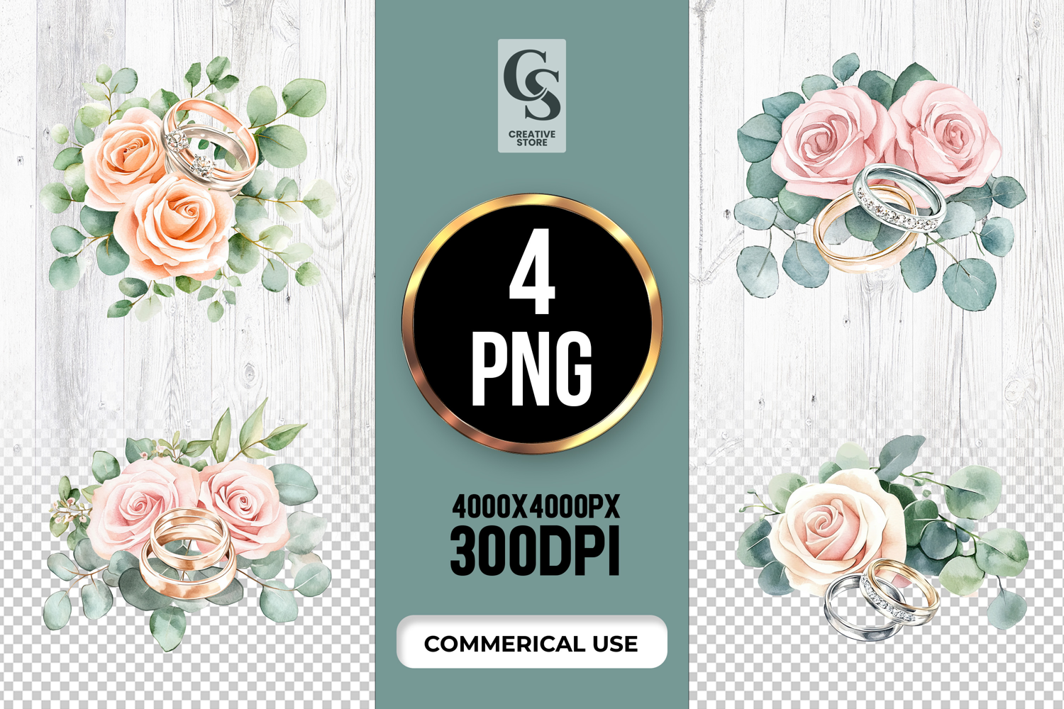 4 Wedding Rings With Roses Clipart Sublimation PNG Files Perfect for Greeting Cards, Invitations, Junk Journal, Party Decor, Scrapbooking and many other craft projects.