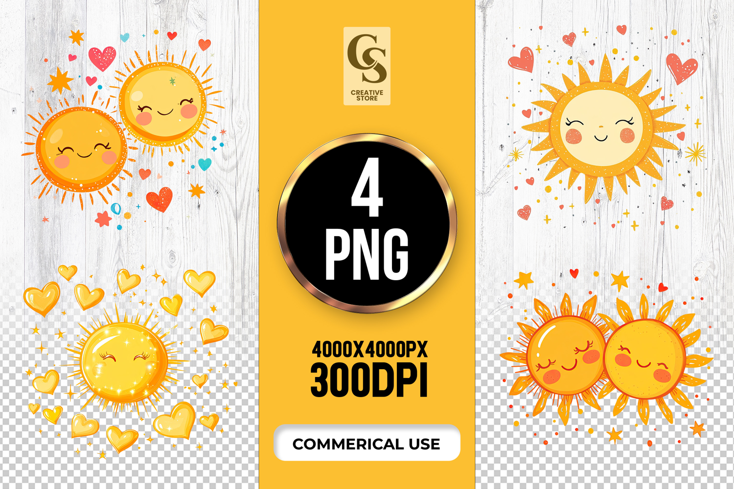 4 Cute Smiling Sun Clipart Sublimation PNG Files Perfect for Greeting Cards, Invitations, Junk Journal, Party Decor, Scrapbooking and many other craft projects.