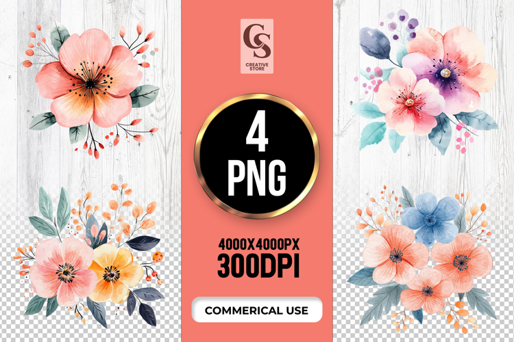 4 Floral Watercolor Clipart PNG Files Perfect for Greeting Cards, Invitations, Junk Journal, Party Decor, Scrapbooking and many other craft projects.