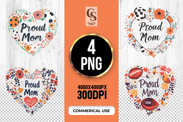 4 Proud Mom Sports Flower Heart Clipart Sublimation PNG Files Perfect for Greeting Cards, Invitations, Junk Journal, Party Decor, Scrapbooking and many other craft projects.