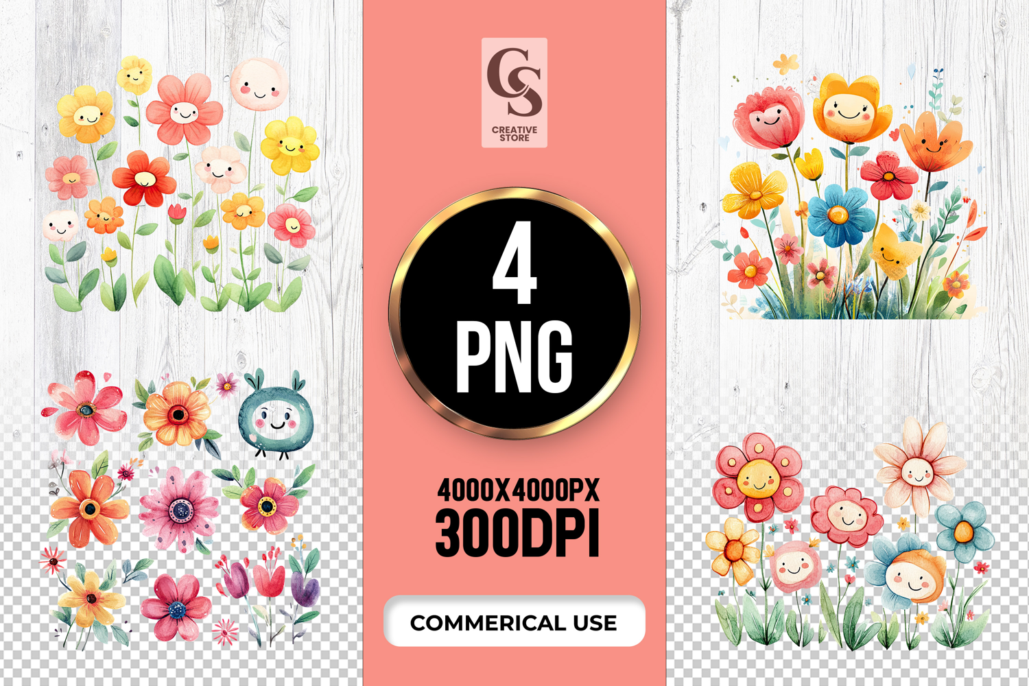 4 Cute Smiley Flower Clipart Sublimation PNG Files Perfect for Greeting Cards, Invitations, Junk Journal, Party Decor, Scrapbooking and many other craft projects.