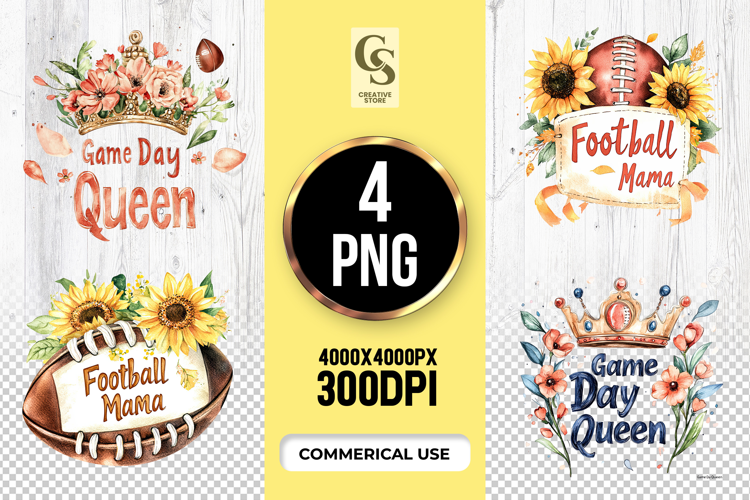 4 Game Day Queen Mama Football Watercolor Clipart Sublimation PNG Files Perfect for Greeting Cards, Invitations, Junk Journal, Party Decor, Scrapbooking and many other craft projects.