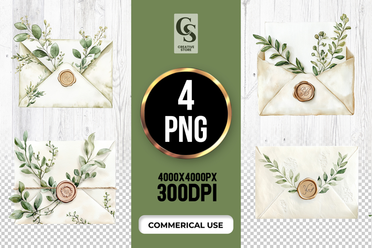 4 Botanical Envelope Greenery Watercolor Clipart Sublimation PNG Files Perfect for Greeting Cards, Invitations, Junk Journal, Party Decor, Scrapbooking and many other craft projects.