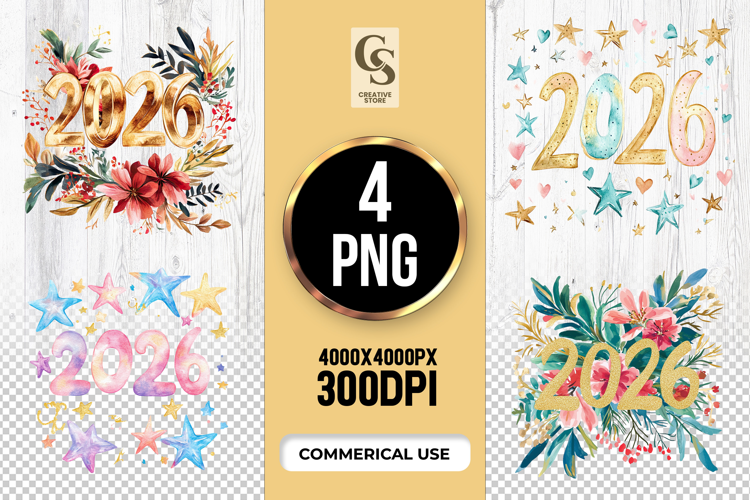 4 Year 2026 Floral Star Watercolor Clipart Sublimation PNG Files Perfect for Greeting Cards, Invitations, Junk Journal, Party Decor, Scrapbooking and many other craft projects.