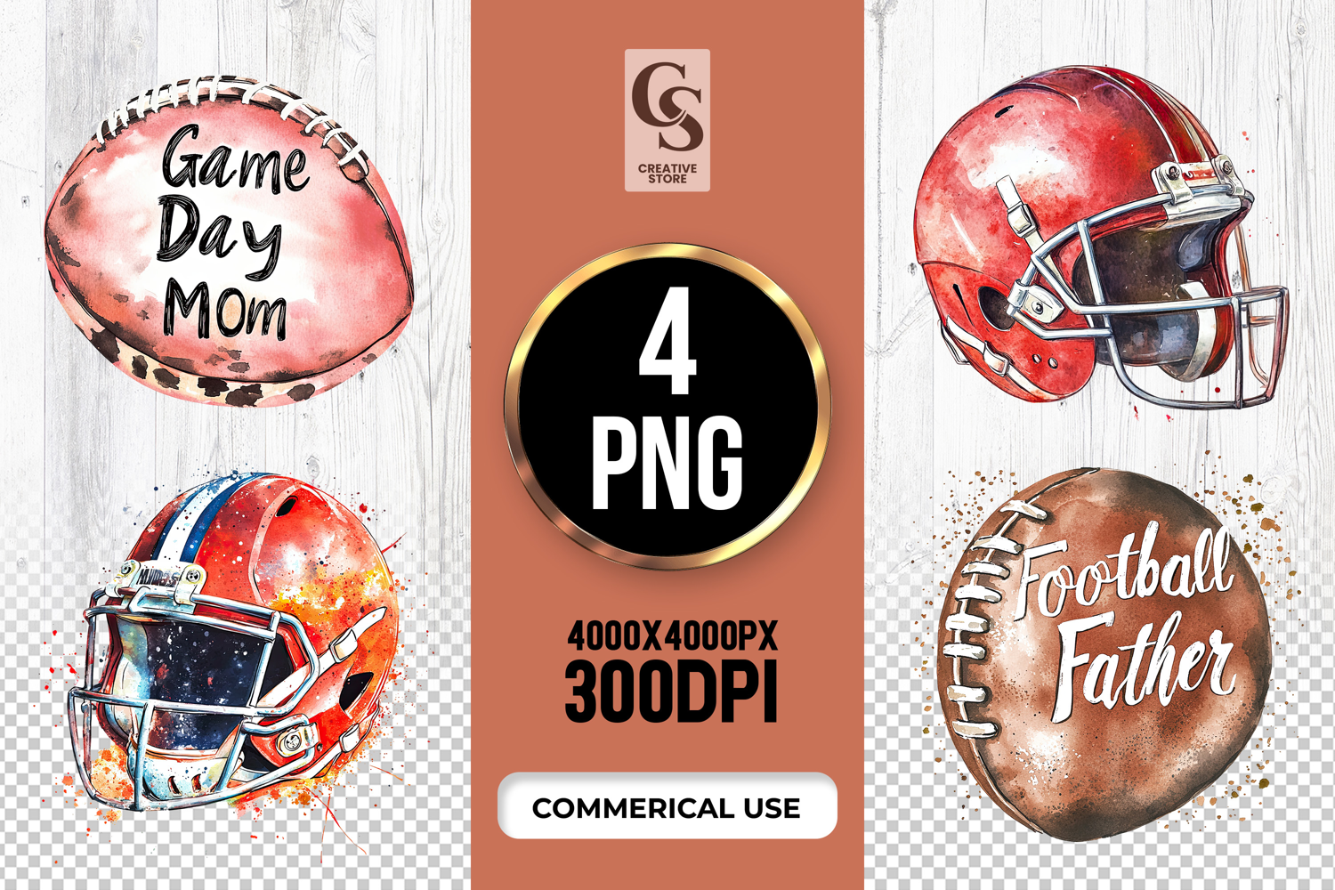 4 Football Mom Dad Helmet Watercolor Clipart Sublimation PNG Files Perfect for Greeting Cards, Invitations, Junk Journal, Party Decor, Scrapbooking and many other craft projects.