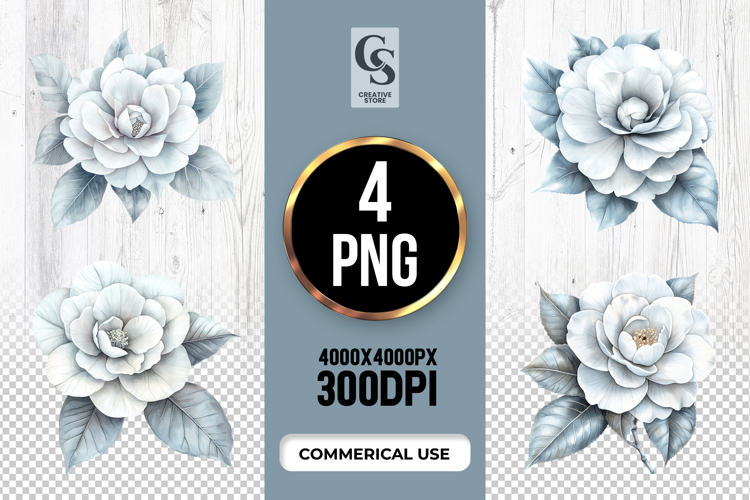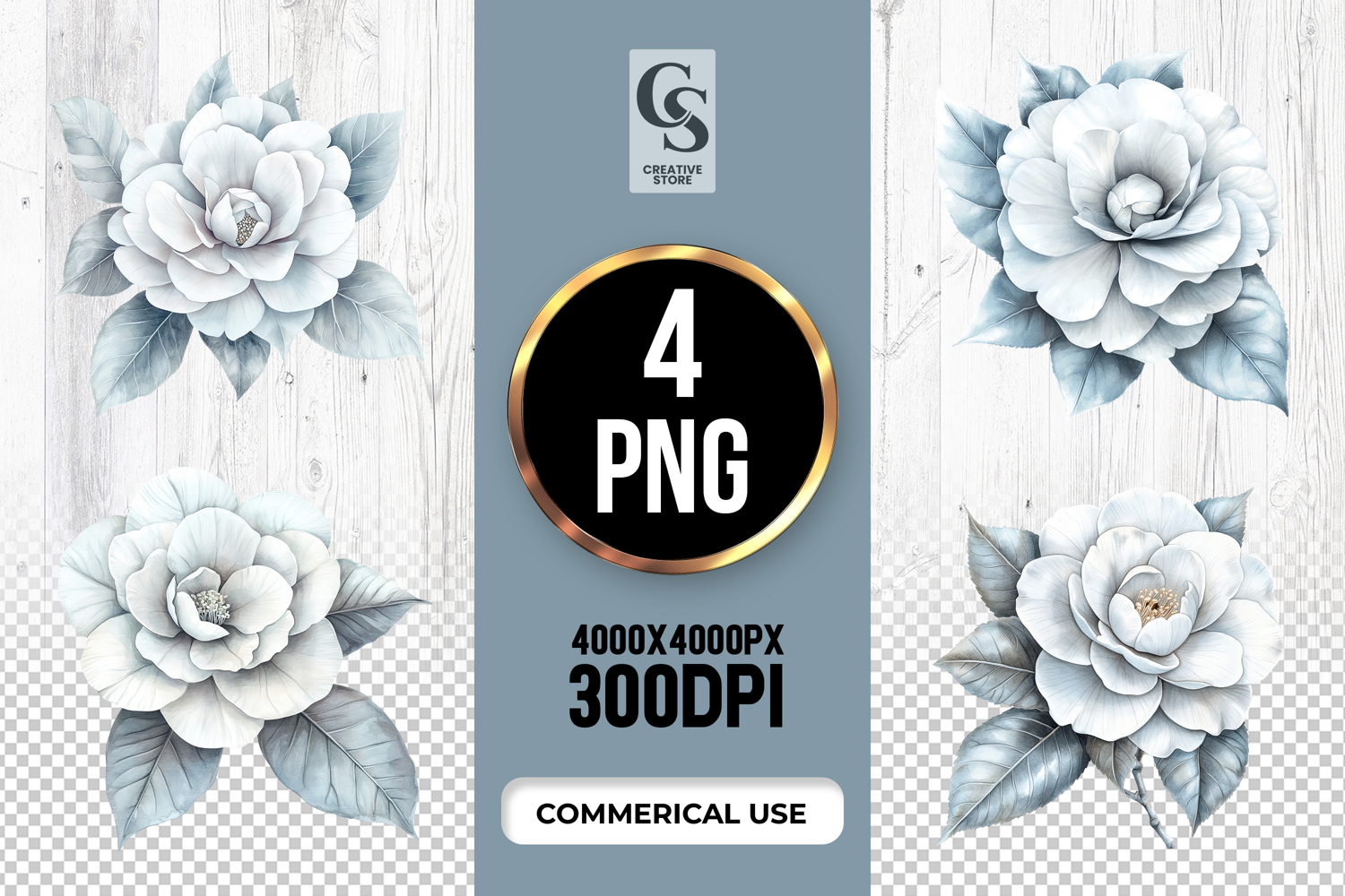 Pastel Floral Design White Rose Sublimation Botanical Wedding Clipart White Flower Sublimation Icy Floral Clipart Dusty Blue Leaves Png Winter Bloom Sublimation Elegant Camellia Clipart Cool Tone Flower Png Frosted Greenery Design