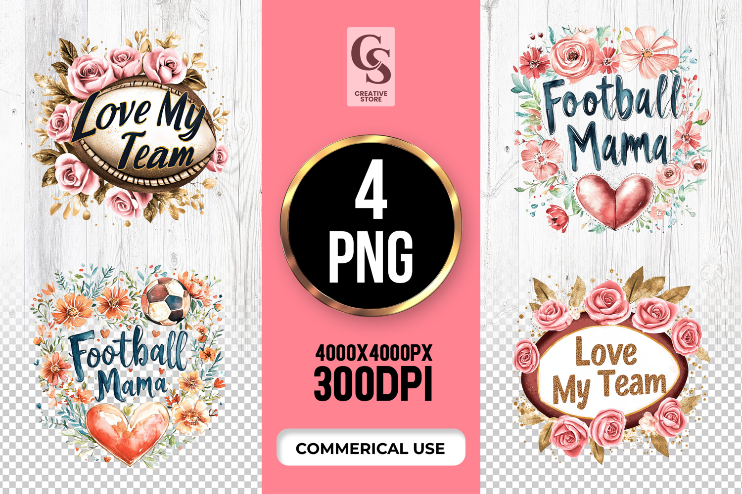 4 Watercolor Football Mama Floral Clipart Sublimation PNG Files Perfect for Greeting Cards, Invitations, Junk Journal, Party Decor, Scrapbooking and many other craft projects.
