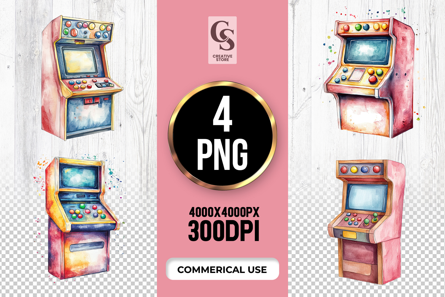 4 Retro Arcade Machine Watercolor Clipart Sublimation PNG Files Perfect for Greeting Cards, Invitations, Junk Journal, Party Decor, Scrapbooking and many other craft projects.