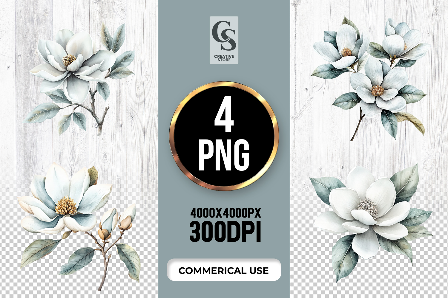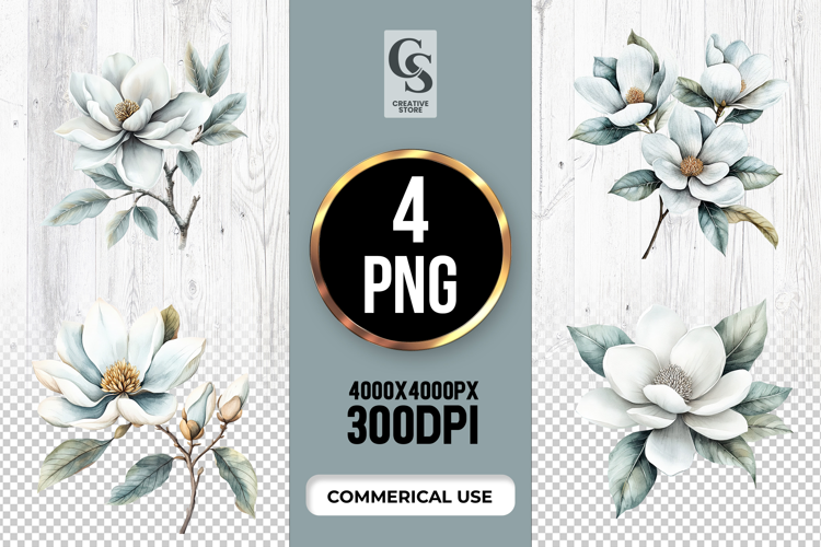 4 White Magnolia Watercolor Floral Clipart Sublimation PNG Files Perfect for Greeting Cards, Invitations, Junk Journal, Party Decor, Scrapbooking and many other craft projects.