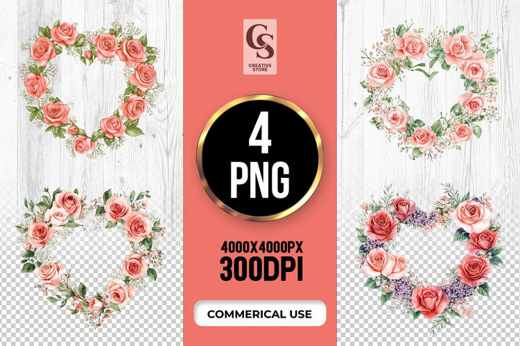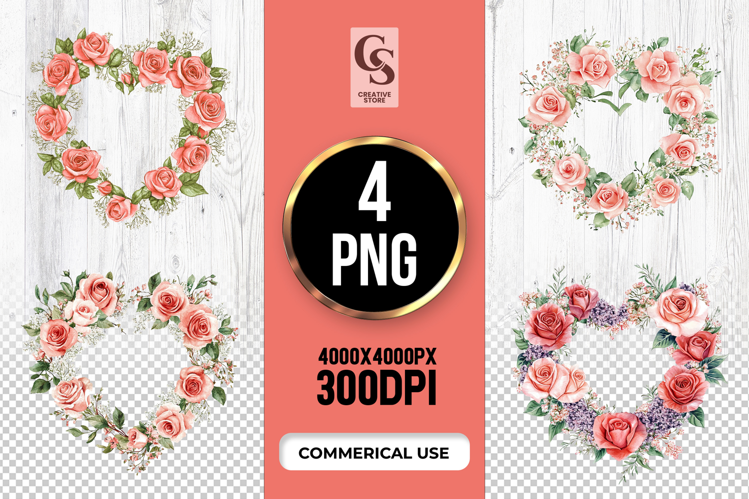 4 Heart Rose Wreath Watercolor Floral Clipart Sublimation PNG Files Perfect for Greeting Cards, Invitations, Junk Journal, Party Decor, Scrapbooking and many other craft projects.
