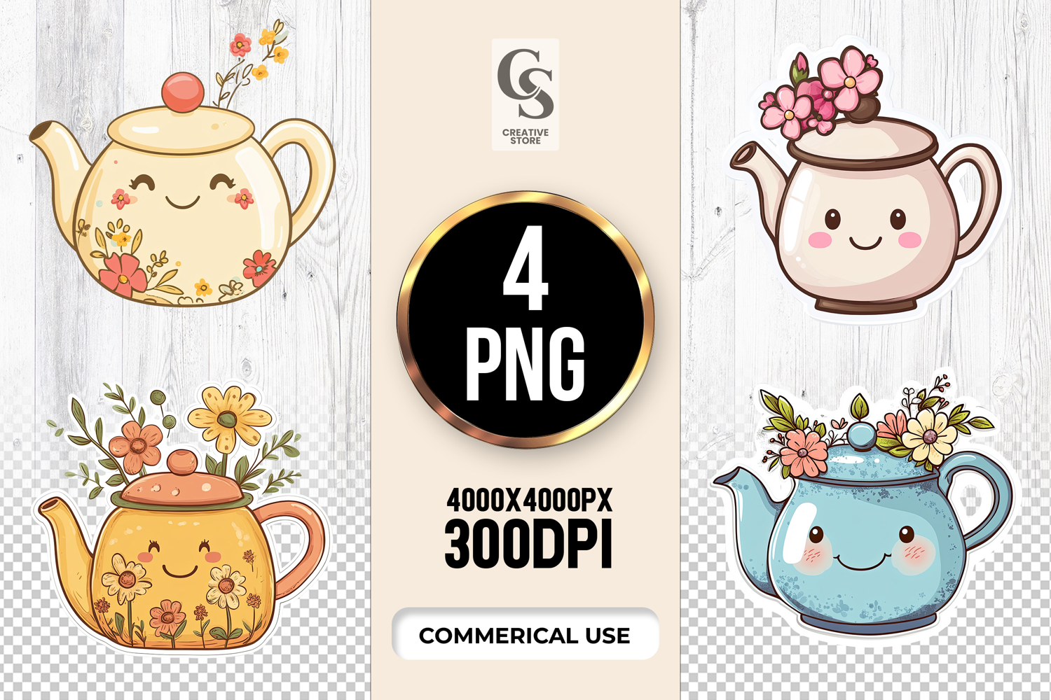 4 Kawaii Floral Teapot Cute Tea Clipart Sublimation PNG Files Perfect for Greeting Cards, Invitations, Junk Journal, Party Decor, Scrapbooking and many other craft projects.