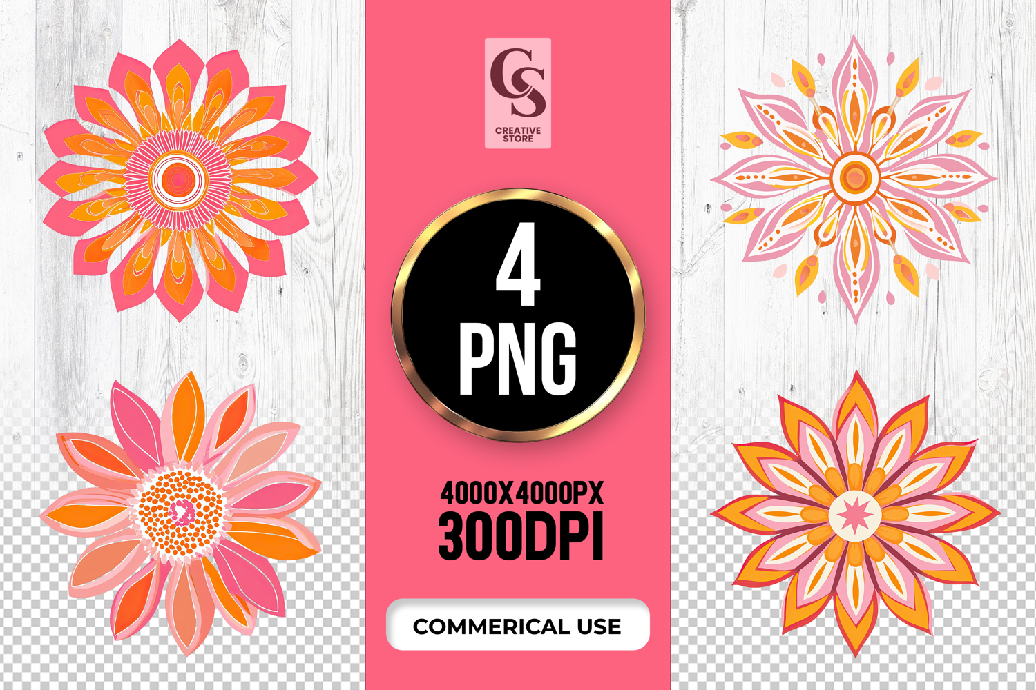 4 Pink Orange Mandala Flower Clipart Sublimation PNG Files Perfect for Greeting Cards, Invitations, Junk Journal, Party Decor, Scrapbooking and many other craft projects.