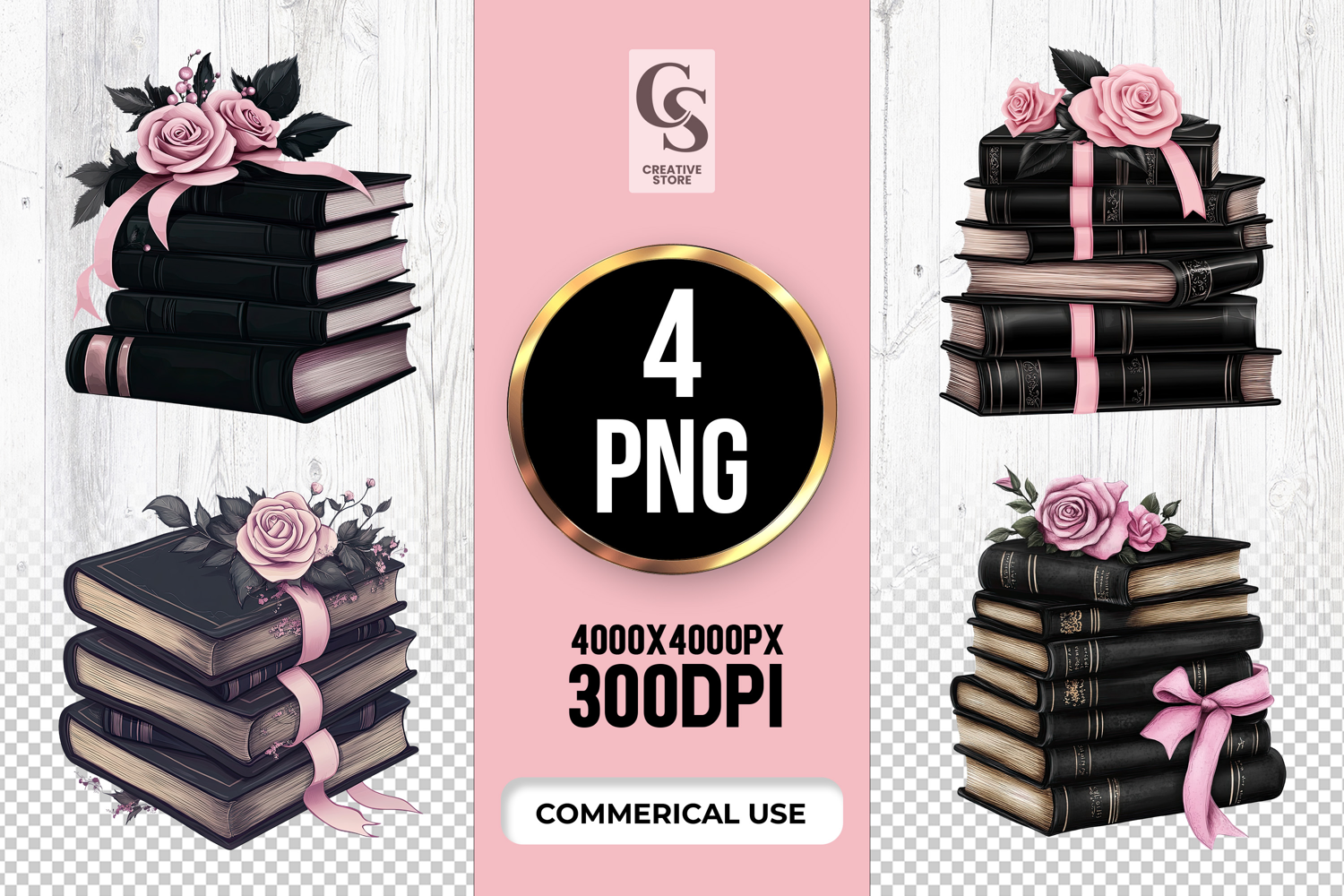 4 Black Vintage Book Stack Clipart Sublimation PNG Files Perfect for Greeting Cards, Invitations, Junk Journal, Party Decor, Scrapbooking and many other craft projects.