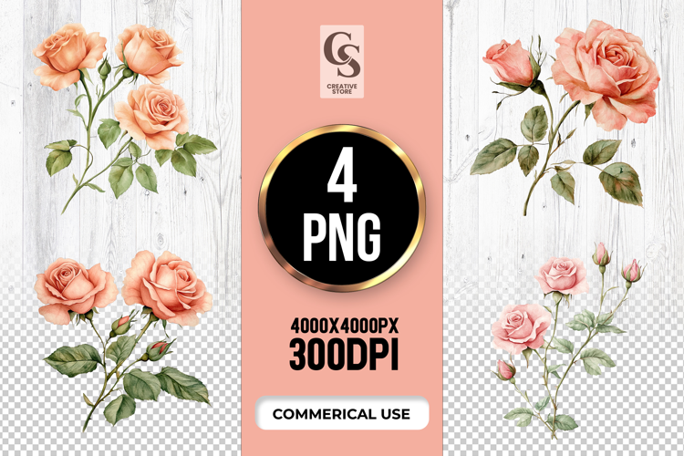 4 Peach Rose Botanical Flower Clipart Sublimation PNG Files Perfect for Greeting Cards, Invitations, Junk Journal, Party Decor, Scrapbooking and many other craft projects.