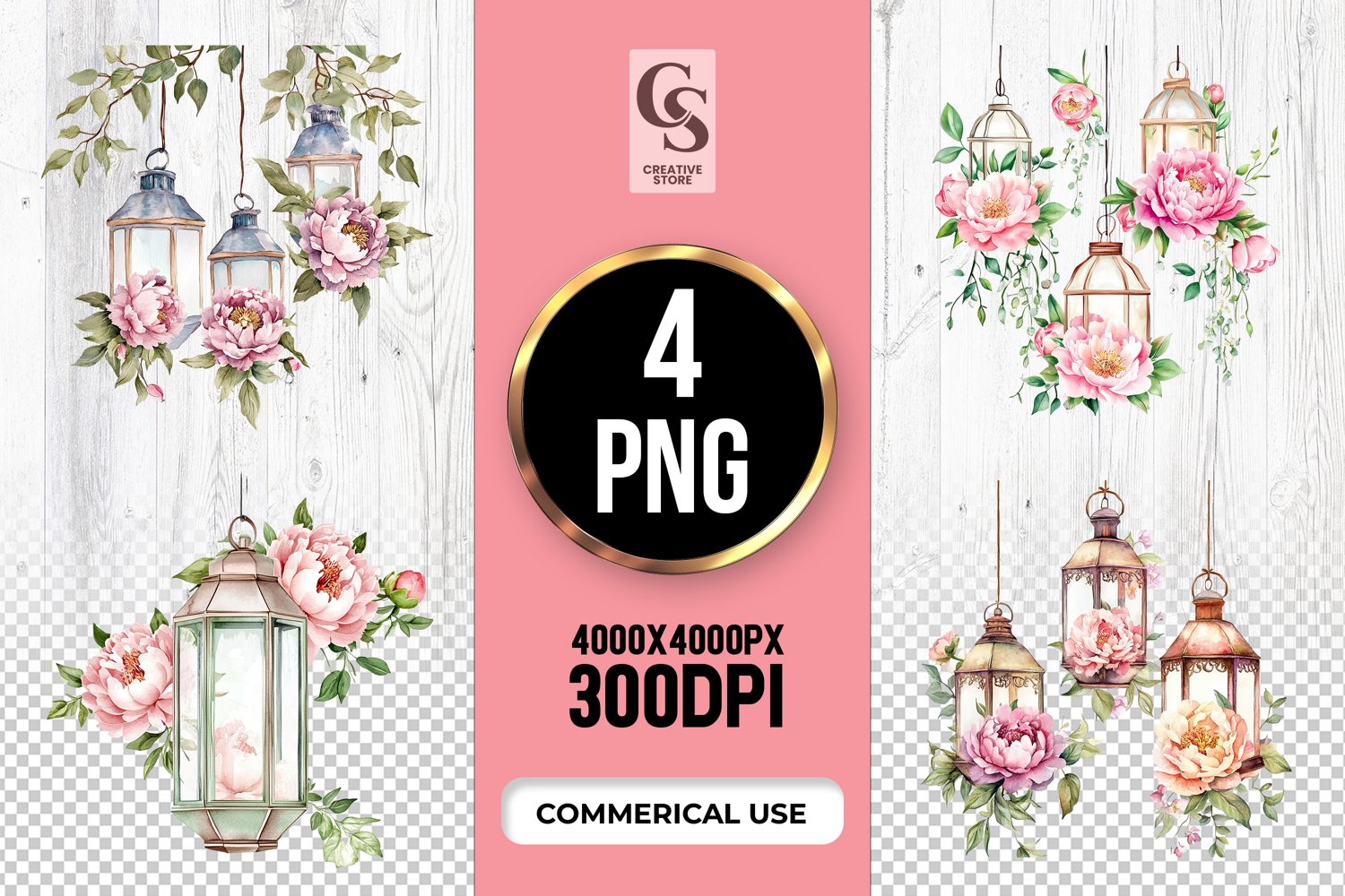 4 Floral Lantern Peony Clipart Sublimation PNG Files Perfect for Greeting Cards, Invitations, Junk Journal, Party Decor, Scrapbooking and many other craft projects.