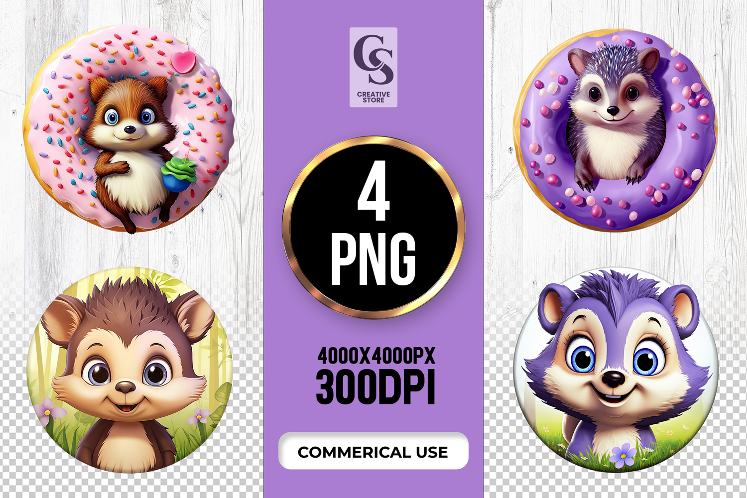 4 Cute Hedgehog With Donut Cartoon Clipart Sublimation PNG Files Perfect for Greeting Cards, Invitations, Junk Journal, Party Decor, Scrapbooking and many other craft projects.