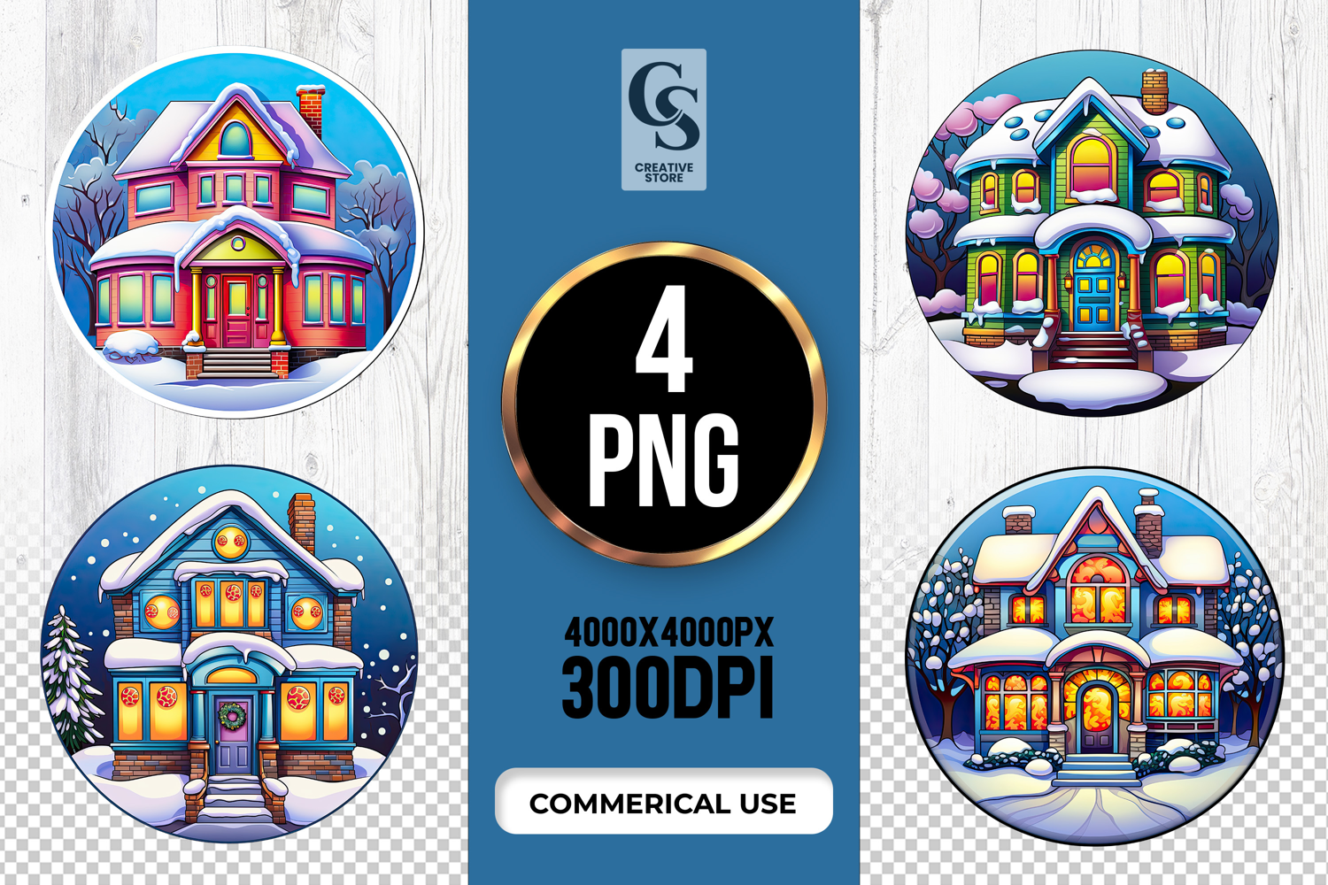 4 Cozy Winter House Snow Scene Clipart Sublimation PNG Files Perfect for Greeting Cards, Invitations, Junk Journal, Party Decor, Scrapbooking and many other craft projects.