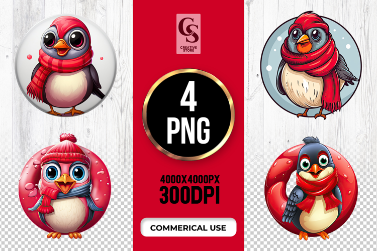 4 Cute Winter Bird Scarf Cartoon Clipart Sublimation PNG Files Perfect for Greeting Cards, Invitations, Junk Journal, Party Decor, Scrapbooking and many other craft projects.