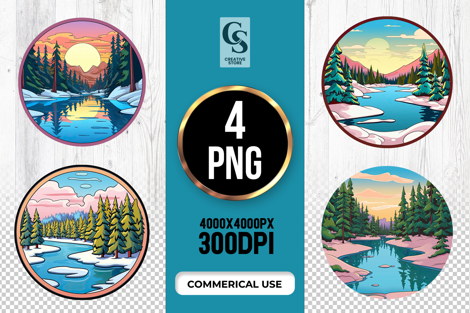 4 Winter Forest River Landscape Clipart Sublimation PNG Files Perfect for Greeting Cards, Invitations, Junk Journal, Party Decor, Scrapbooking and many other craft projects.