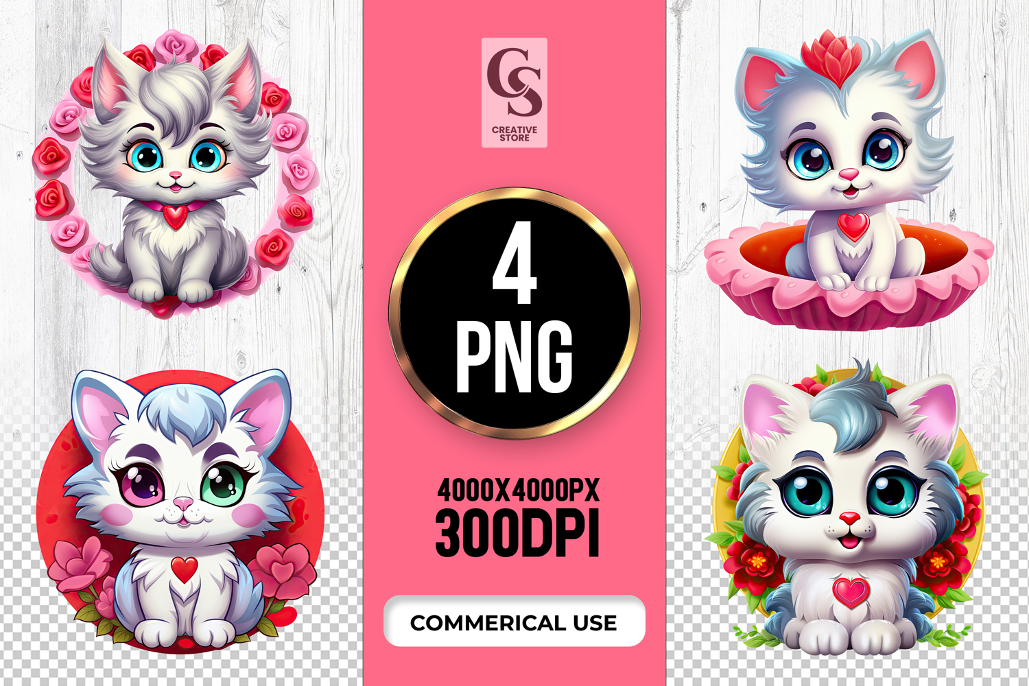 4 Cute Kitten Flower Heart Clipart Sublimation PNG Files Perfect for Greeting Cards, Invitations, Junk Journal, Party Decor, Scrapbooking and many other craft projects.