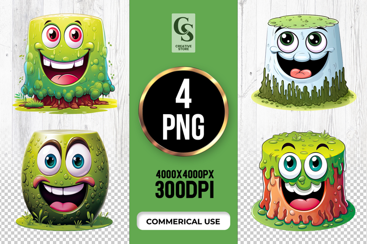 4 Funny Slime Monster Cartoon Clipart Sublimation PNG Files Perfect for Greeting Cards, Invitations, Junk Journal, Party Decor, Scrapbooking and many other craft projects.