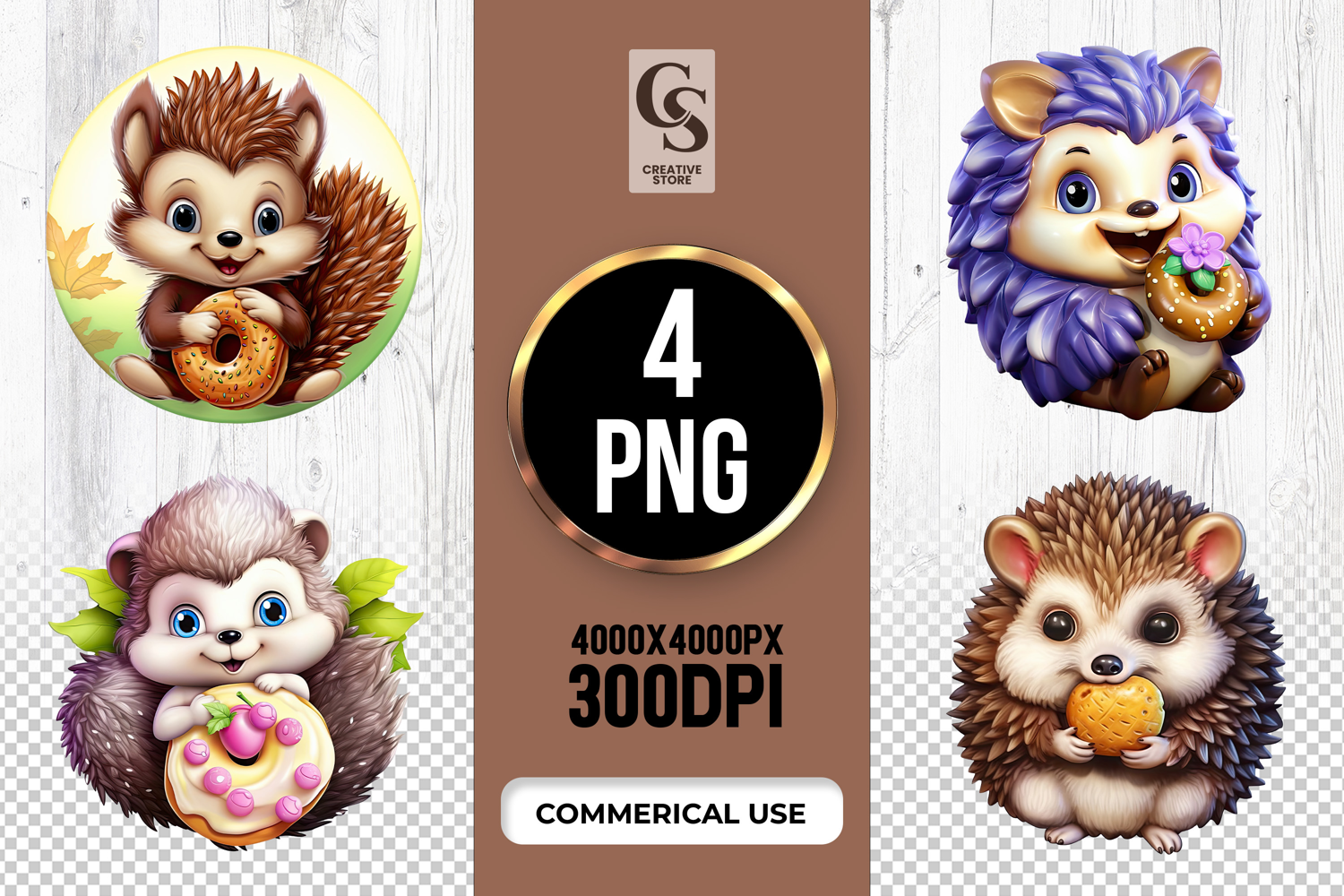 4 Cute Hedgehog Donut Cookie Clipart Sublimation PNG Files Perfect for Greeting Cards, Invitations, Junk Journal, Party Decor, Scrapbooking and many other craft projects.