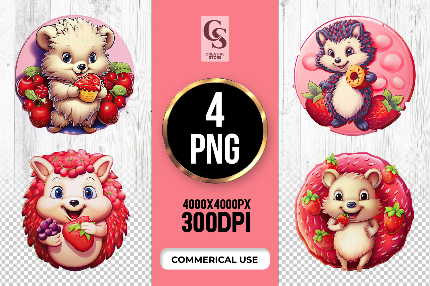 4 Cute Hedgehog With Strawberry Clipart Sublimation PNG Files Perfect for Greeting Cards, Invitations, Junk Journal, Party Decor, Scrapbooking and many other craft projects.